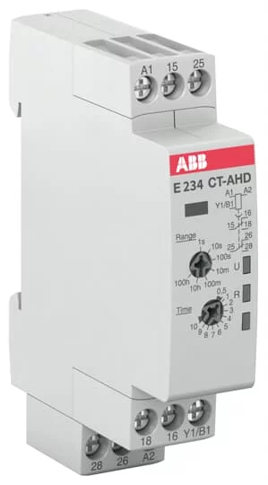 Description: The CT-AHD.22 is a single-function electronic time relay from the CT-D timer range. It provides an OFF-delay (delay on break) function with 7 time ranges from 0.05 s to 100 h. This time relay operates with a rated control supply voltage of 24 - 48 V DC / 24 - 240 V AC and has a 2 c/o (SPDT) output with contacts rated at 250 V / 4 A. A control input works with voltage-related (non-floating) triggering.